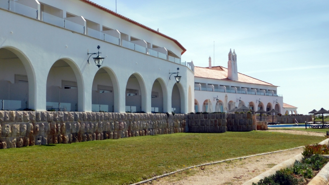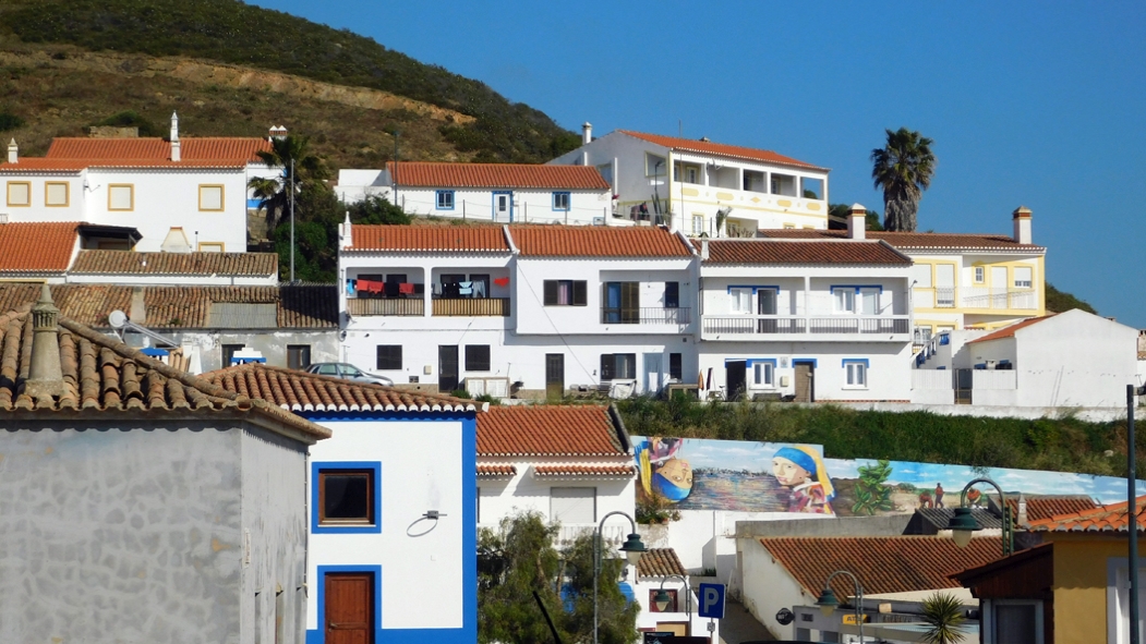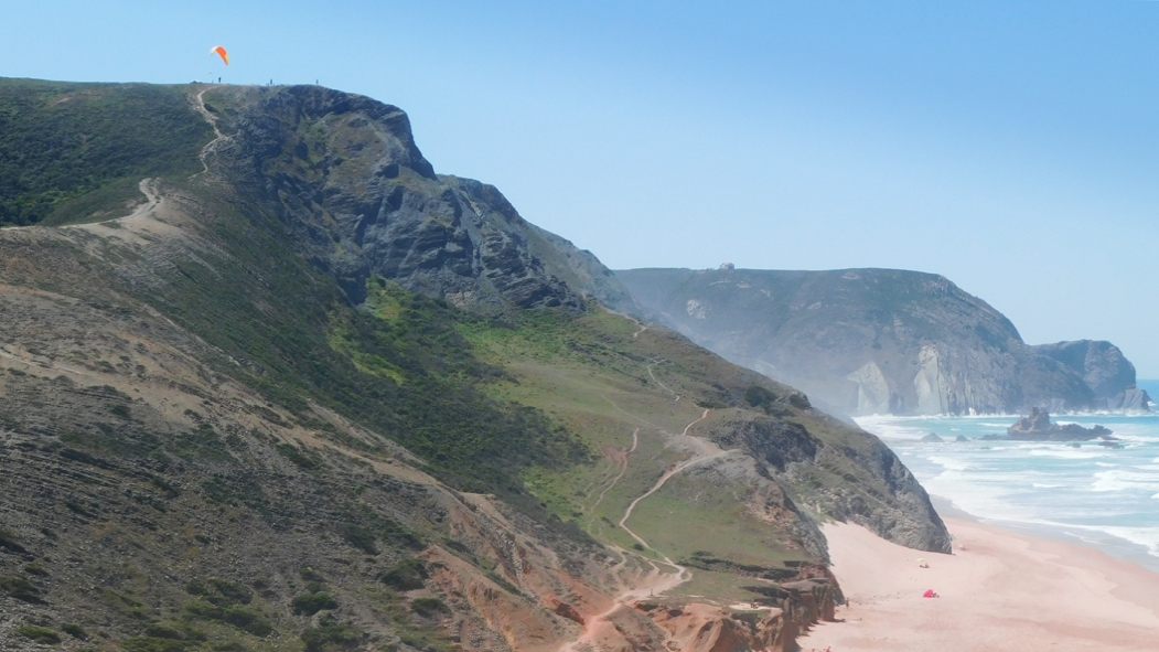 Rechts hinten der Praia do Amado. Im April sind selbst manche Klippen grün.