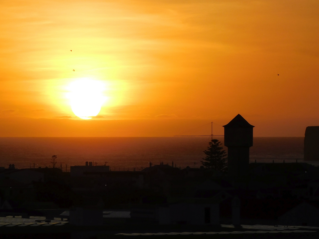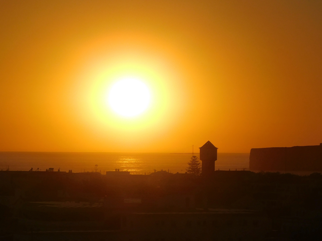 Sonnenuntergang im heiligen Sagres am ENDE DER WELT. Die Sonne wünscht dem Wasserturm und mir eine GUTE NACHT. Sie wird in den 14 Tagen meines Besuchs jeden Tag strahlen und mein Herz erwärmen.