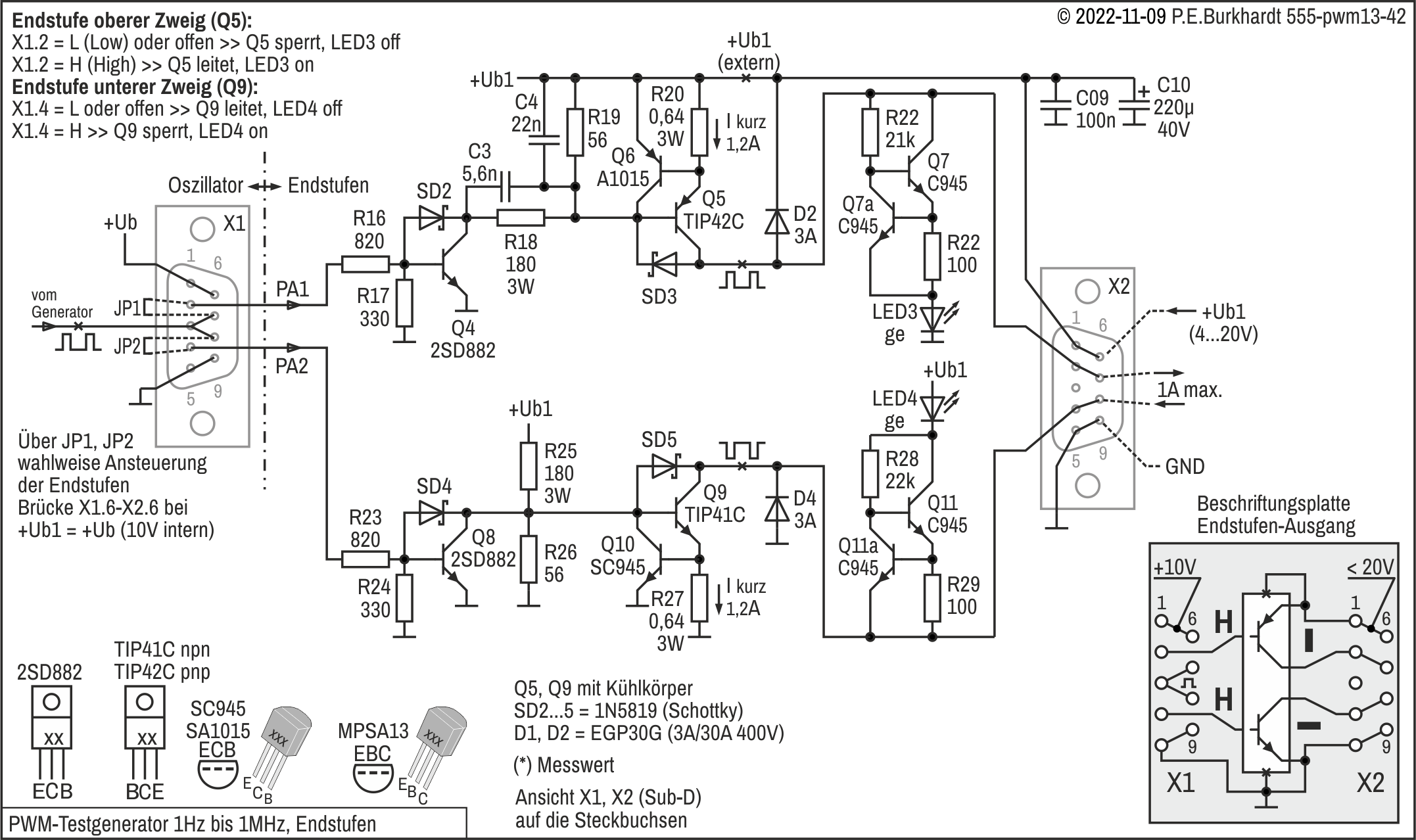 Hier sind nur diese Änderungen beschrieben. Darüber hinaus ist die Schaltungsbeschreibung der Version von 2012 gültig (siehe PWM-Testgenerator 10 Hz bis 10 kHz, universelle 1A-Endstufe).